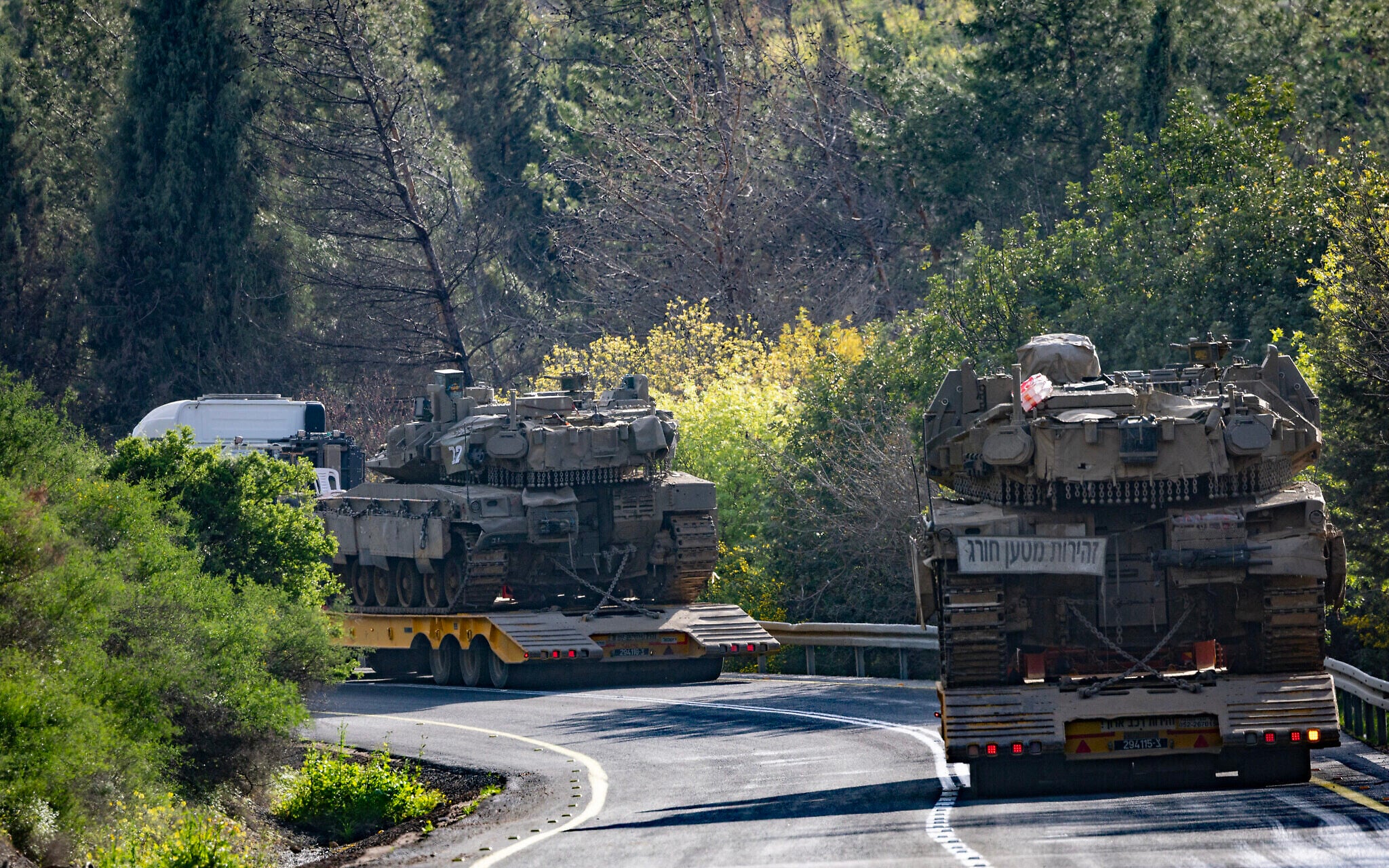 Lorries carrying army tanks drive along a road near the border with Lebanon in the Upper Galilee in northern Israel on March 20, 2026. (Odd ANDERSEN / AFP)