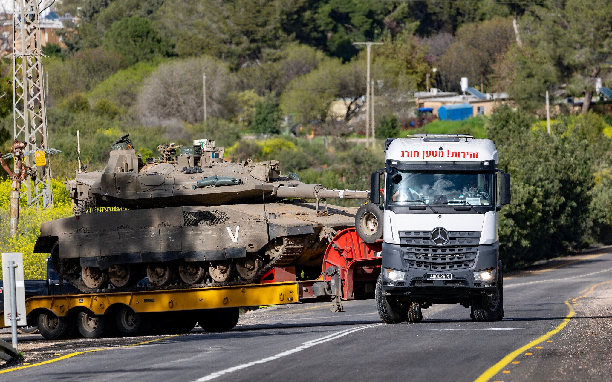 A lorry carrying an army tank drives along a road near the border with Lebanon in the Upper Galilee in northern Israel on March 20, 2026. (Odd ANDERSEN / AFP) /