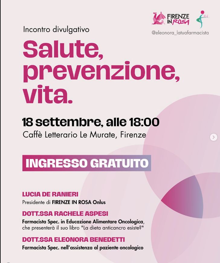 La serata, organizzata in collaborazione con Firenze in Rosa, sarà un’occasione per parlare in modo semplice, accessibile e coinvolgente di prevenzione, diagnosi precoce e cura, con un’attenzione particolare al mondo femminile. Al centro dell’evento, due protagoniste d’eccezione: la dott.ssa Rachele Aspesi, farmacista, autrice e formatrice specializzata in nutrizione oncologica, e un’altra farmacista esperta nell’assistenza al paziente oncologico, che porterà la sua esperienza sul campo.
