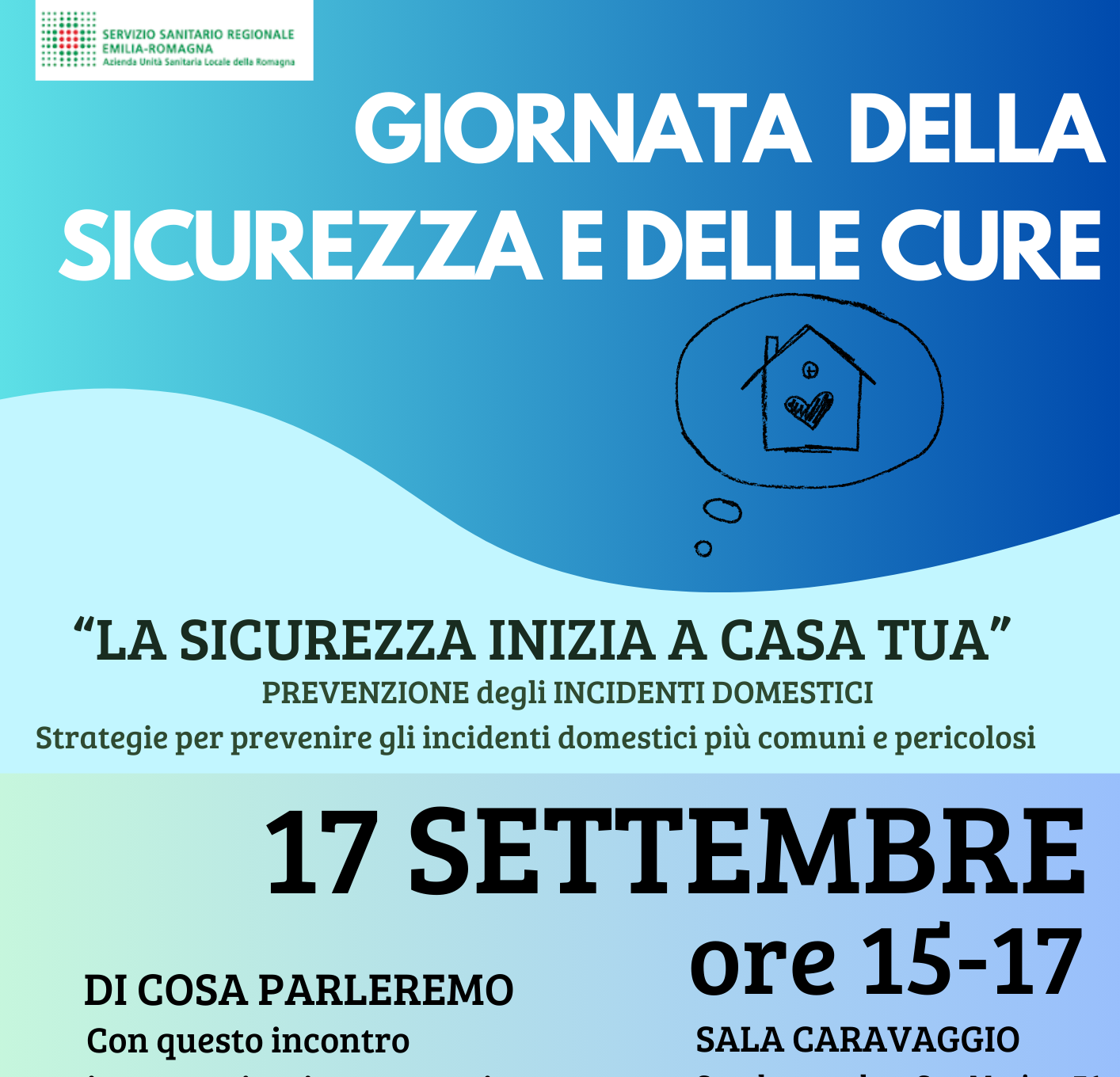 • ‘La sicurezza inizia a casa tua’ a Rimini. Gli operatori del Dipartimento di Sanità Pubblica organizzano l’evento gratuito dal titolo “La sicurezza inizia a casa tua” per la prevenzione degli incidenti domestici più comuni: si svolgerà mercoledì 17 settembre dalle ore 15 alle 17 nella Sala Caravaggio di Ausl Romagna (Strada consolare San Marino 76, di fianco al Toys Center). I partecipanti potranno imparare a riconoscere i pericoli nascosti in casa, adottando semplici strategie per proteggere sé stessi e i propri cari. Info: tel. 334 3429196, mail promosalute.rn@auslromagna.it .