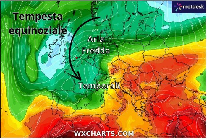 INIZIO AUTUNNO SPRINT, SI PARTE CON LA TEMPESTA EQUINOZIALE, La mappa qui sotto mette bene in evidenza tale ipotesi con la tempesta equinoziale sospinta da aria fredda centrata sul Nord Europa; successivamente le correnti potrebbero sfondare sul bacino del Mediterraneo favorendo la formazione di un ciclone.