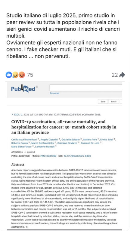 Sono parecchi i casi in cui vengono condivisi sui Social studi o presunti tali, che dimostrerebbero un collegamento tra le vaccinazioni contro il SARS-CoV-2 e un aumento dell’incidenza dei tumori nei pazienti con una o più dosi. Il fantomatico legame tra vaccini Covid e cancro è una narrazione molto apprezzata negli ambienti No vax. Ogni volta però si scopre che tali paper – per come sono stati prodotti – non possono rovesciare quel ch’è emerso nella letteratura scientifica, dove la presunta associazione coi tumori non emerge mai. Abbiamo trattato diversi casi precedenti, per esempio qui, qui e qui. Stavolta riscontriamo le condivisioni Facebook di uno studio italiano di recente pubblicazione, il quale rivelerebbe «che i sieri genici covid aumentano il rischio di cancri multipli». Ma già dall’abstract si nota che qualcosa non torna.