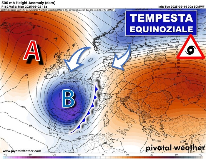 La mappa qui sotto mette bene in evidenza l’evoluzione prevista con la tempesta equinoziale sospinta da aria fredda in rapida discesa dal Nord Europa; successivamente le correnti riuscirebbero a sfondare sul bacino del Mediterraneo favorendo la formazione di un ciclone.
