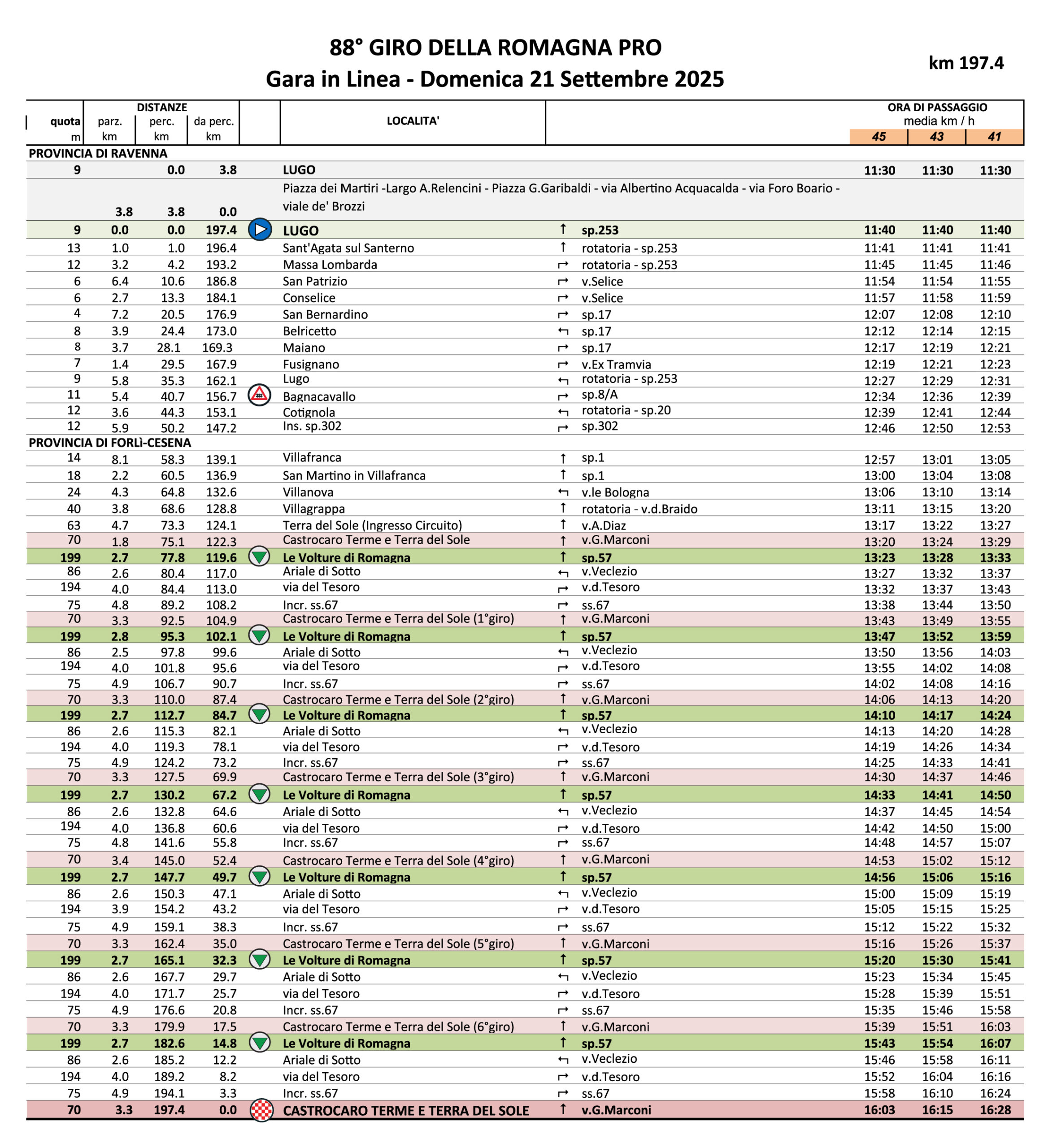 Come lo scorso anno, partenza e arrivo saranno posti rispettivamente a Lugo e a Castrocaro Terme, ma il percorso affrontato sarà abbastanza diverso, misurando 197,4 chilometri e proponendo 2300 metri di dislivello, circa 800 in più rispetto al 2024. Nella prima parte di gara si percorrerà un tratto in linea totalmente pianeggiante che, attraversando i comuni che negli ultimi anni sono stati più volte colpiti dalle alluvioni, riporterà prima i corridori a transitare da Lugo e poi a puntare verso la località di arrivo, con il primo passaggio sul traguardo di Castrocaro Terme che avverrà dopo 75,1 chilometri dal via.