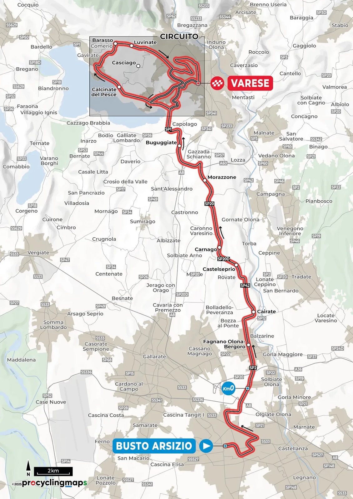 Terminate le sette tornate in programma mancheranno 62,8 chilometri alla conclusione e si entrerà quindi nel secondo circuito, lungo 31,4 chilometri e da ripetere per due volte. Dopo l’ascesa del Montello e la successiva discesa verso il lago, i corridori dovranno girare a destra (e non, come in precedenza, a sinistra) in direzione Gavirate e, una volta raggiunta la località di Oltrona al Lago, inizieranno a salire verso Barasso e Luvinate passando dal muro delle Cinque Piante e dallo strappo di via Matteotti, proseguendo poi in falsopiano fino a Casciago. Dopo lo scollinamento, nuova discesa verso il lago e un’ultima scalata dei Ronchi per raggiungere il traguardo.