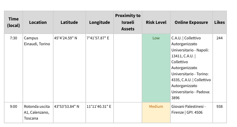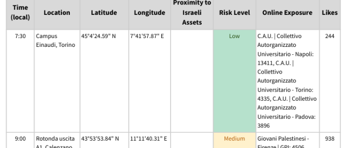 Sul sito del Ministero israeliano per la Diaspora e la lotta all’antisemitismo è stato pubblicato un dettagliato rapporto con le coordinate dei luoghi e città delle manifestazioni solidali con la Palestina, con i nomi delle principali associazioni promotrici delle manifestazioni e un indice di pericolosità delle stesse graficamente indicato in tre colori: basso (verde), medio (giallo) e alto (rosso).