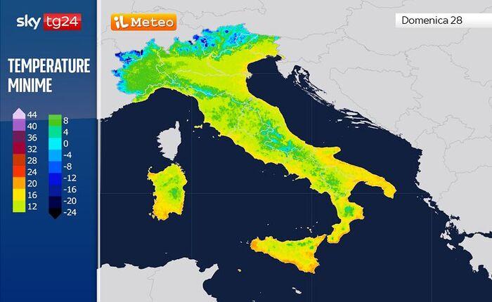 Un’attenzione particolare meritano le temperature notturne, destinate a scendere in maniera significativa. Nelle zone dove il cielo si aprirà durante la notte, grazie alla dispersione del calore accumulato di giorno, si potranno toccare valori inferiori ai 10°C, anche sulla Valle Padana e nelle aree interne del Centro.