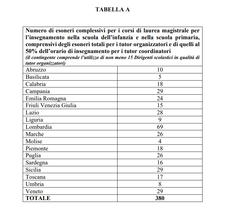 Il contingente complessivo ammonta a 380 unità. Di queste, fino a 365 saranno riservate al personale docente, mentre almeno 15 posti saranno coperti da dirigenti scolastici con incarico di tutor organizzatore.