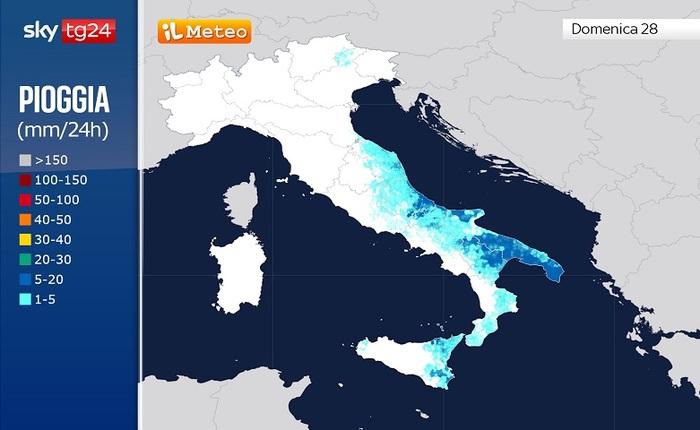 Ed ora occupiamoci delle brutte notizie; il fronte perturbato di Sabato 27, infatti, raggiungerà le regioni del Sud, facendo sentire la sua negativa influenza anche lungo il distretto adriatico del Centro. Sarà dunque una Domenica 28 piuttosto grigia e a tratti piovosa, specie al mattino su Marche, Abruzzo, Molise fino ai comparti settentrionali della Puglia, con qualche piovasco atteso anche sull’area tirrenica tra Sicilia e Calabria.