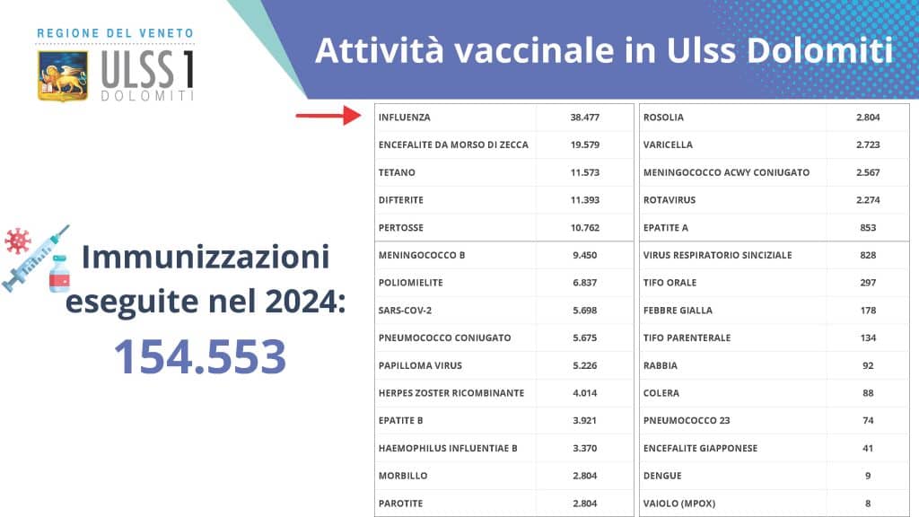 Delle 38mila vaccinazioni antinfluenzali, quasi 31mila (pari all’81%) sono state effettuate dai pediatri di libera scelta e dai medici di medicina generale; più di 2mila quelli somministrati nelle farmacie (24 quelle che hanno aderito nelle prime ventiquattr’ore dal lancio della campagna 2025; lo scorso anno nello stesso arco di tempo furono 17). Ampia la platea di bellunesi per i quali la vaccinazione è raccomandata e gratuita.