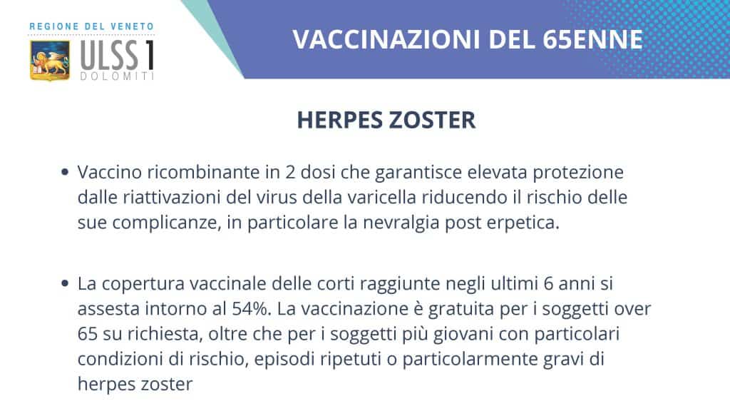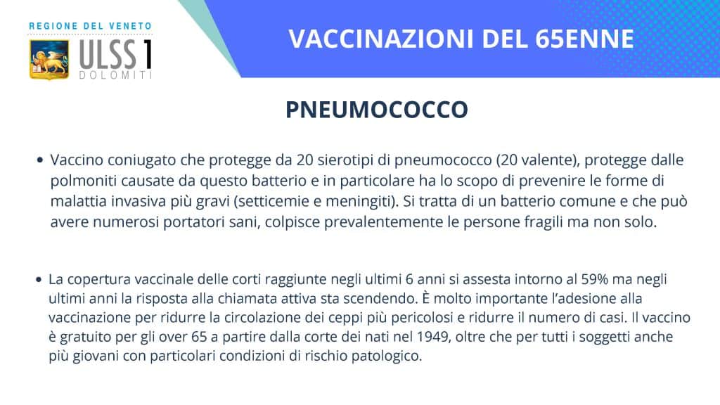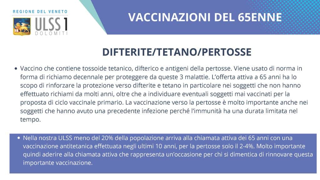 L’offerta vaccinale regionale è ampia, ma l’Ulss 1 Dolomiti mette in particolare risalto l’opportunità per gli over 65 di procedere ad altre tre vaccinazioni: Herpes Zoster (il “fuoco di Sant’Antonio”), pneumococco e difterite/tetano/pertosse. Questa campagna vaccinale è attiva tutto l’anno e prevede l’invito via lettera a tutti i residenti in provincia al compimento del sessantacinquesimo anno di età.