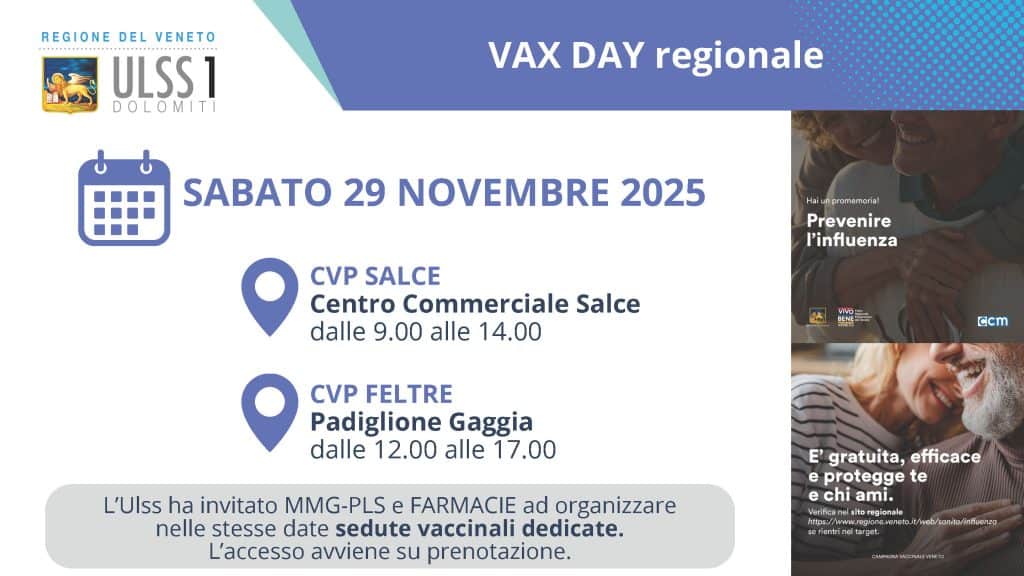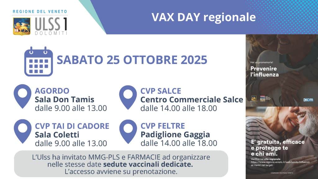 Confermata anche per quest’anno la possibilità di vaccinarsi dal proprio pediatra o dal medico di base, così come nelle farmacie. Già istituiti due vax day per il 25 ottobre (Agordo, Tai di Cadore, Belluno e Feltre) e per il 29 novembre (Belluno e Feltre). In questo caso sarà necessario prenotare.