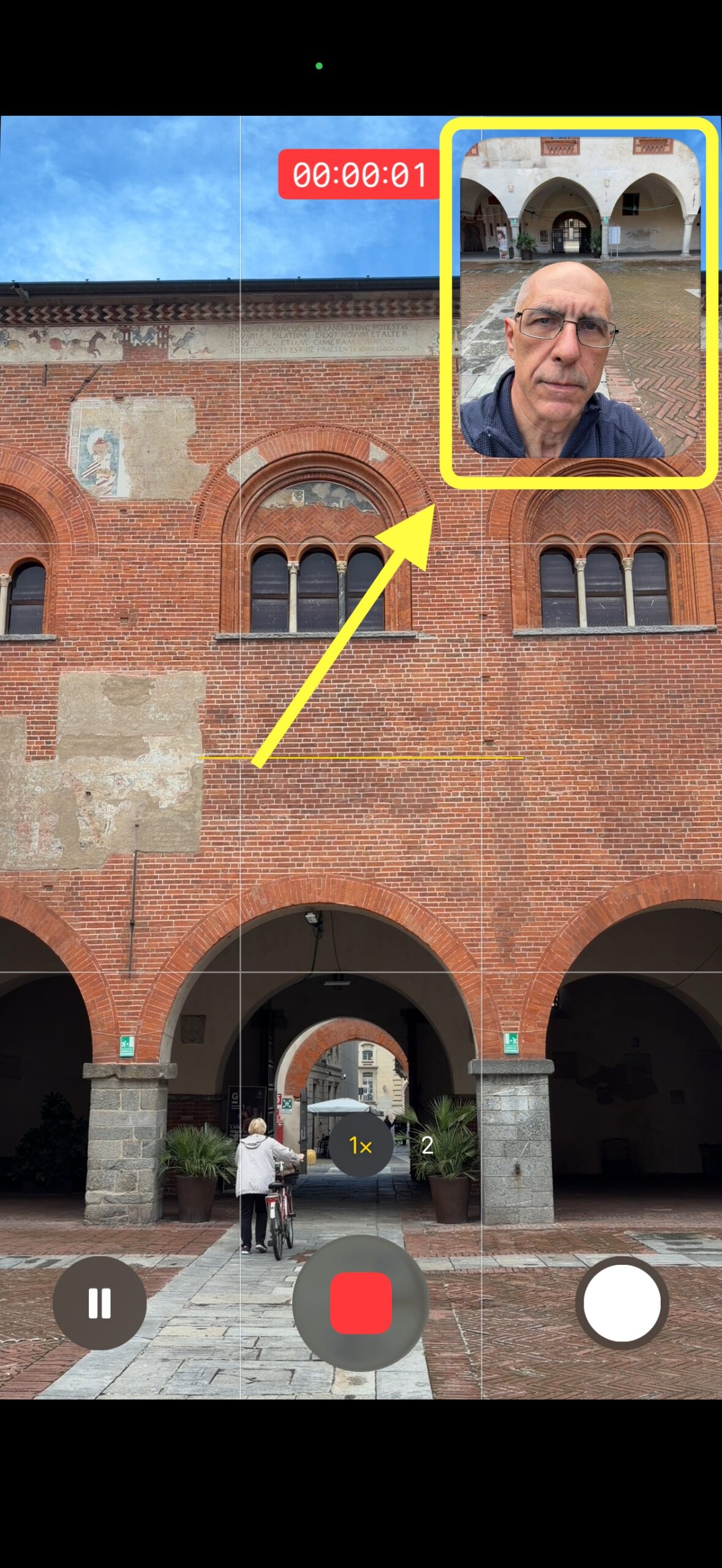 In pratica, consente di filmare contemporaneamente con la fotocamera posteriore e quella frontale, inserendo il volto dell’utente in un riquadro picture-in-picture sovrapposto al video principale. Il riquadro si può spostare in tempo reale negli angoli dello schermo, ma non è modificabile in post-produzione.