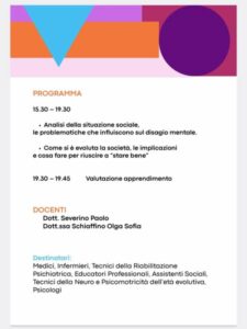 Di tutto questo parleranno a Chiavari al teatro Charitas in via Marana il 10 ottobre alle 15.30 i dottori Paolo Severino e Olga Sofia Schiaffino del dipartimento salute mentale dell’Asl4. Dopo la proiezione di un cortometraggio realizzato da operatori e utenti della Salute Mentale Asl 4 seguirà un dibattito. L’evento è aperto alla cittadinanza.