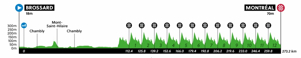 273,2 chilometri in terra canadese con partenza da Brossard ed arrivo a Montreal. Prima parte di gara in linea di 112,4 chilometri, poi si entra nel circuito che sarà identico a quello del GP Montreal, classica World Tour pre autunnale. Dodici le tornate per la prova maschile: 13,4 chilometri con tre salite, Côte Camillien-Houde (1,8 km all’8%), Côte de Polytechnique (780 metri al 6%) e Pagnuelo (600 metri al 7%). Arrivo ad Avenue du Parc, con un tratto in leggera salita (attorno al 4%).