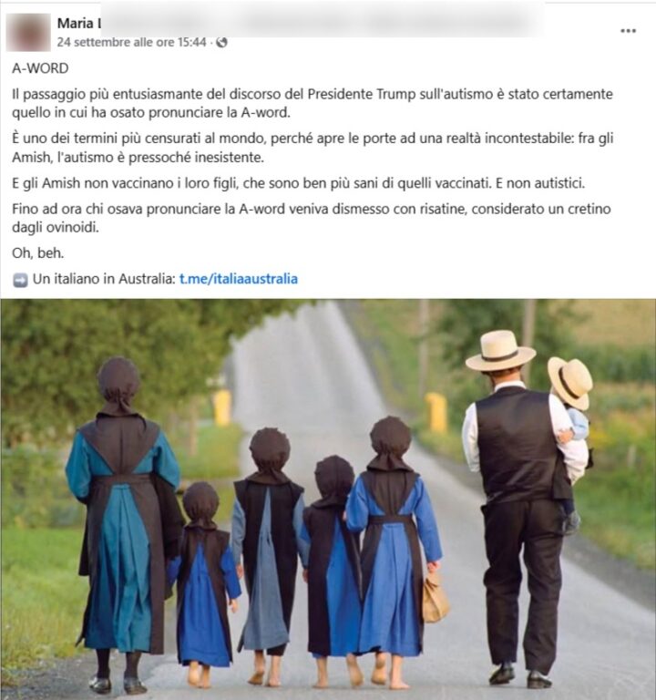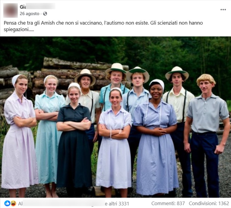 Uno dei post fuorvianti sul tema Amish, vaccini e autismo.