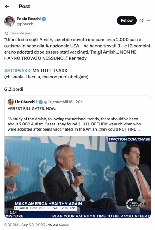 Inoltre, l’affermazione secondo cui gli Amish rifiutano tutti i vaccini è anch’essa falsa: un sondaggio del 2011 ha indicato che il 68% dei genitori Amish aveva vaccinato almeno una volta i propri figli, e solo il 14% aveva scelto l’esenzione completa, principalmente per timore di effetti avversi e non per motivi religiosi.