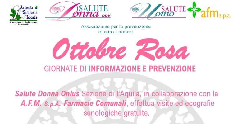 L’AQUILA – Si rinnova anche quest’anno la collaborazione tra l’Afm e l’Associazione Salute Donna OdV/Sezione Aq dedicata alla promozione della campagna di sensibilizzazione “Ottobre in rosa” con giornate di informazione e prevenzione contro il tumore al seno.