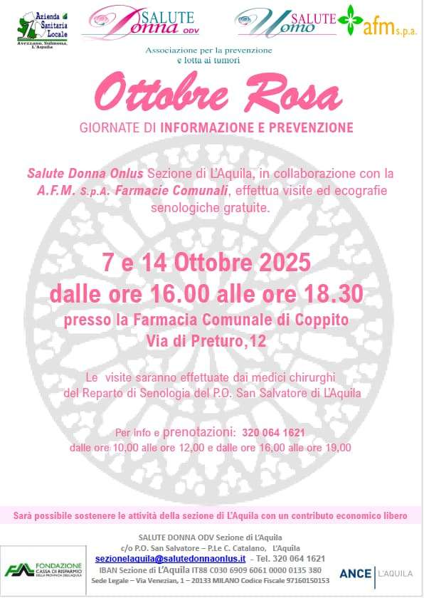 Il 7 e il 14 ottobre dalle 16:00 alle 18.30, presso la farmacia comunale di Coppito (via per Preturo 27), saranno effettuate visite ed ecografie mammarie a cura della Sezione aquilana dell’Associazione Salute Donna OdV con la collaborazione dei medici del Reparto di Senologia del P.O. San Salvatore.
