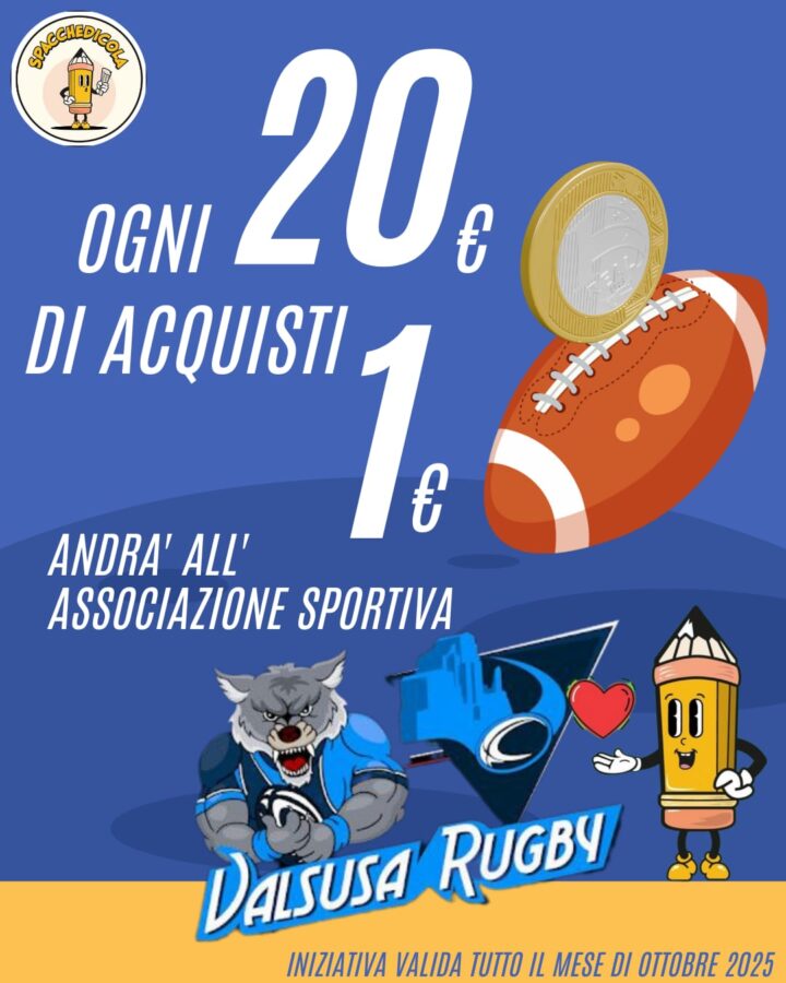 AVIGLIANA – La cartoleria Spacchedicola di Corso Laghi, 139 ad Avigliana annuncia una nuova iniziativa in collaborazione con Valsusa Rugby, pensata per coinvolgere la comunità e valorizzare le attività del territorio. Ogni 20 € spesi verrà donato 1 € all’associazione.