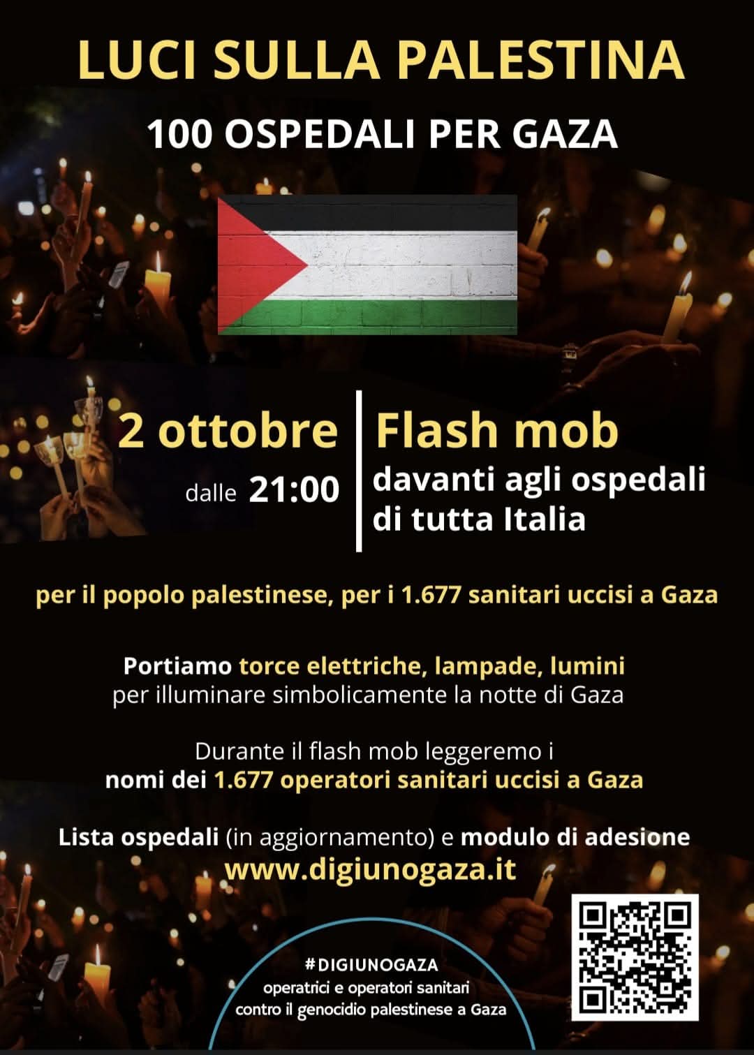 L’appuntamento è per giovedì 2 ottobre alle ore 21 davanti agli ospedali di tutta Italia. Anche al Misericordia di Grosseto. È il flash mob “Luci sulla Palestina – 100 ospedali per Gaza”. Un’iniziativa simbolica che vedrà lavoratrici e lavoratori della sanità, cittadine e cittadini riunirsi con torce, lampade e lumini per illuminare la notte e ricordare i 1.677 operatori sanitari uccisi nei bombardamenti caduti su Gaza.