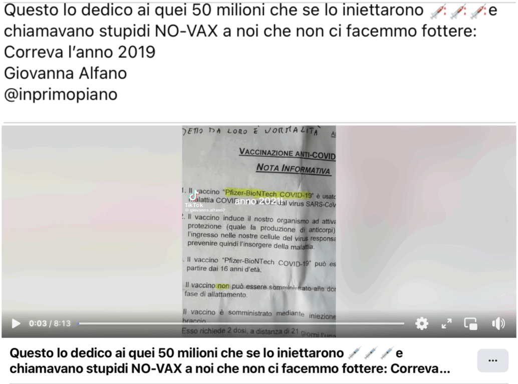 Un discorso simile vale anche per quelli che nei bugiardini vengono indicati con l’eufemismo «effetti indesiderati». Ecco, il fatto che non li chiamino «attenzione, pericolo» dovrebbe suggerirci già qualcosa. Nel documento oggetto del video, la voce narrante legge «Il vaccino potrebbe non proteggere completamente tutti coloro che lo ricevono». Poi però si “scorda” il passaggio successivo: «Infatti l’efficacia stimata dalle sperimentazioni cliniche (dopo due dosi di vaccino) è del 95% e potrebbe essere inferiore in persone con problemi immunitari». Ad ogni modo ricordiamo che il principale scopo dei vaccini è quello di proteggere dalle forme gravi della malattia.