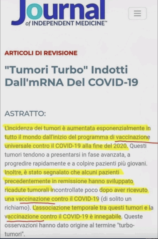 L’articolo sul presunto turbo-cancro collegato ai vaccini Covid è stato pubblicato sul Journal of Independent Medicine. Si tratta di una rivista edita dal dottor Joseph Varon, presidente della Independent Medical Alliance. Parliamo di un’associazione vicina a Robert Kennedy Jr., nota dal marzo 2020 per la sua attività di disinformazione in merito alla pandemia di Covid-19 e ai relativi vaccini.