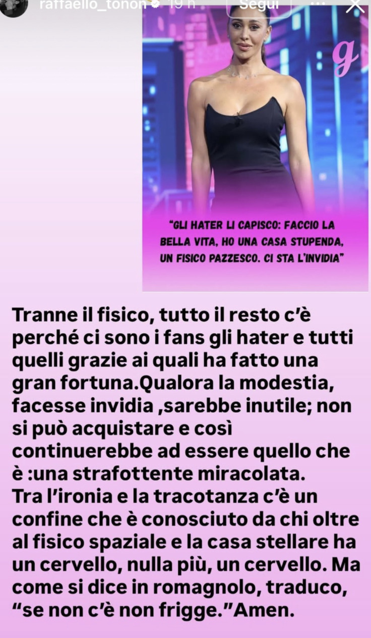 Un attacco che nessuno si aspettava, quello di Raffaello Tonon contro Belen. L’ex GfVip ha condiviso su Instagram una vecchia intervista della showgirl dove scherzava sugli hater che continuano ad attaccarla in ogni occasione: «Li capisco, ho una casa bellissima, faccio vacanze in posti meravigliosi, ho un fisico così, sono anche intelligente. Li capisco se gli girano».