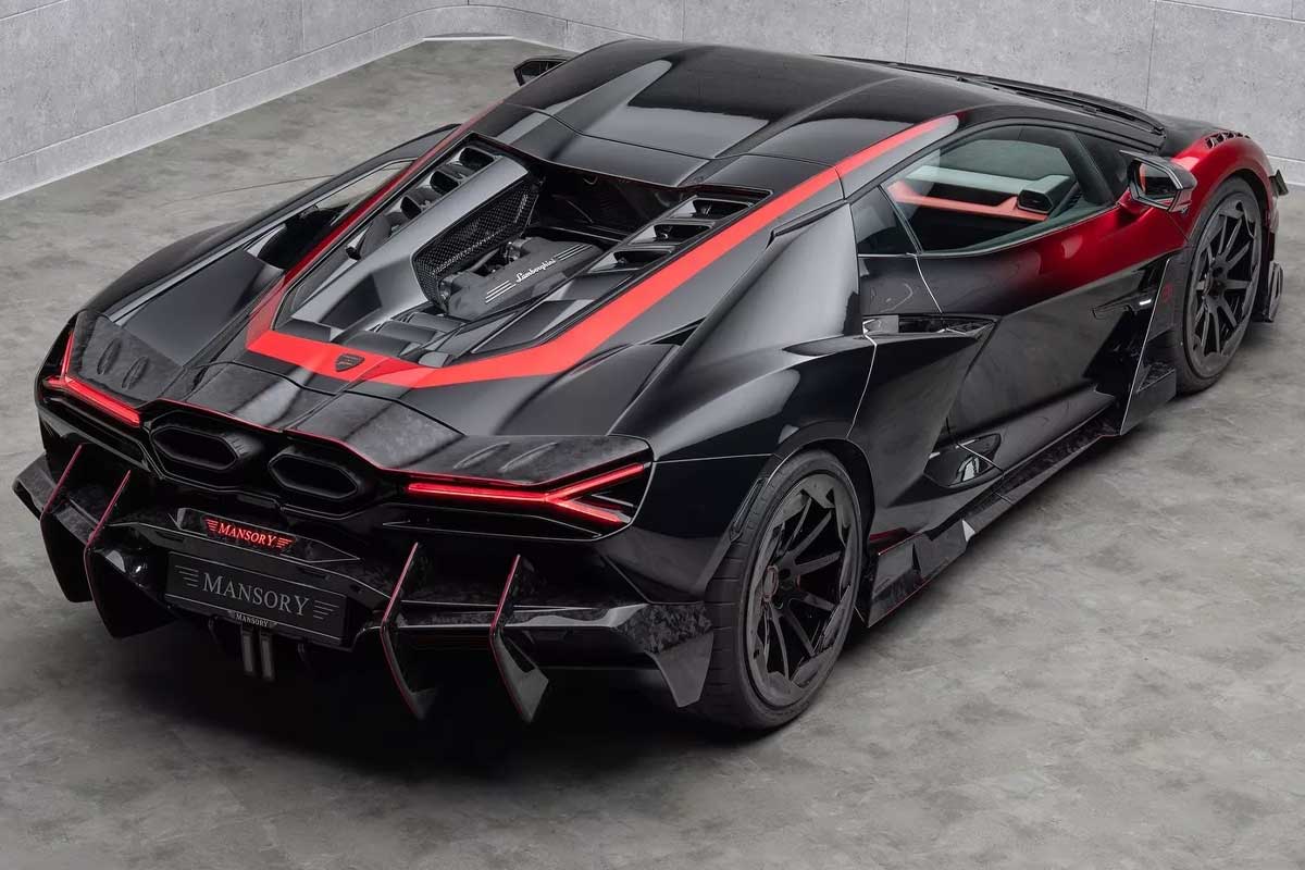 Per contrastare con il nero lucido e il carbonio a vista, Mansory ha aggiunto accenti rossi ai parafanghi anteriori, alle portiere e intorno al cofano. Al posteriore, la trasformazione è altrettanto radicale: lo spoiler idraulico originale è stato sostituito da un massiccio pezzo di carbonio forgiato, accompagnato da un diffusore più aggressivo e da nuove ruote.