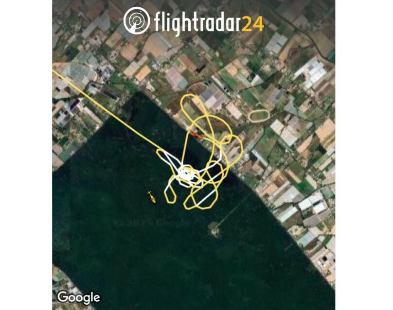 Nella mappa di Flightradar (n basso) si vedono i mezzi di soccorso che sorvolano l’area dell’incidente avvenuto intorno alle 9.25 sopra il bosco di Sabaudia.