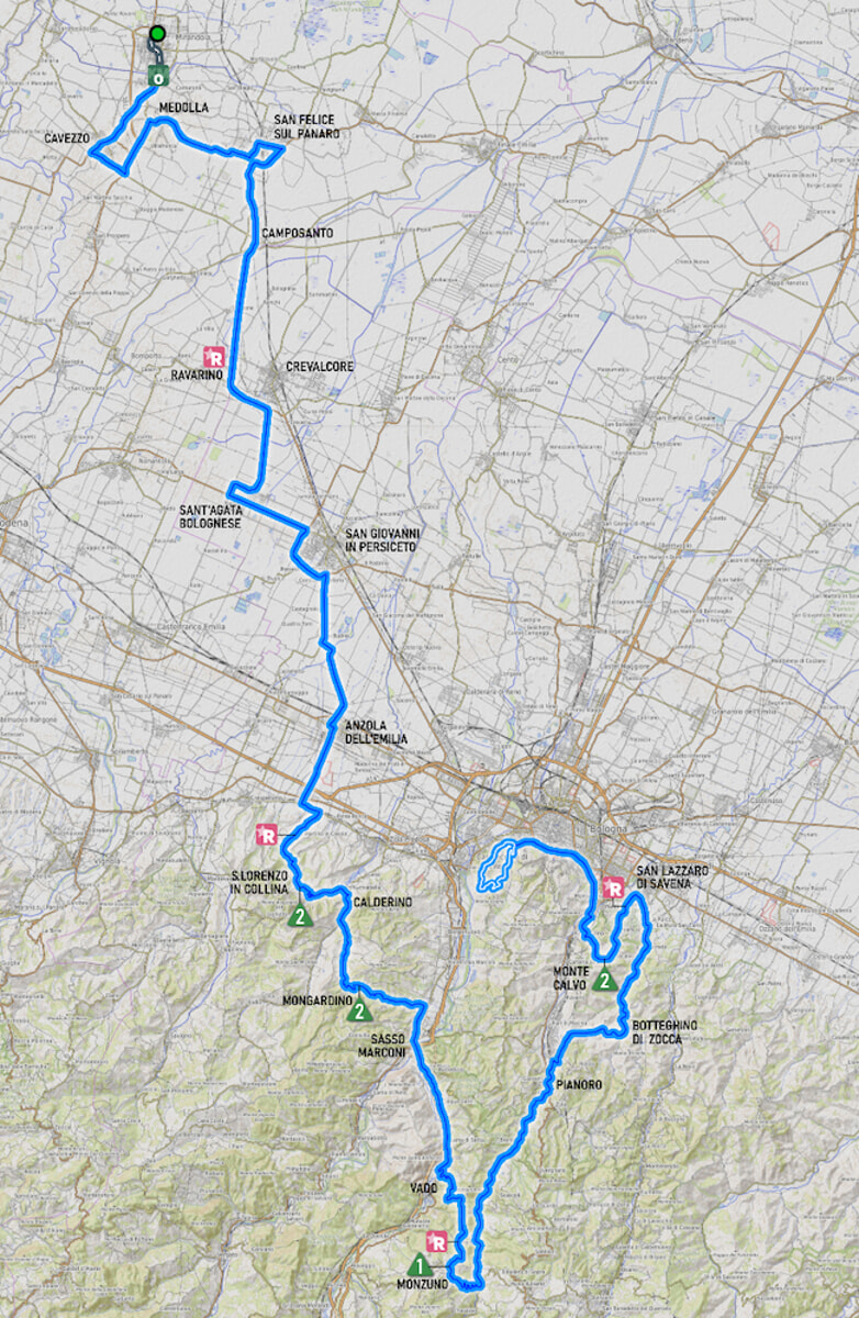 Il Giro maschile 2025 si apre con una prima parte pianeggiante fino a Mirandola, seguita da un percorso sempre più movimentato verso l’Appennino. Dopo i primi Gpm di San Lorenzo in Collina e Mongardino, la corsa affronta la salita di Monzuno, la più lunga della giornata, seguita da strappi e discese tecniche tra Val di Zena e Montecalvo.