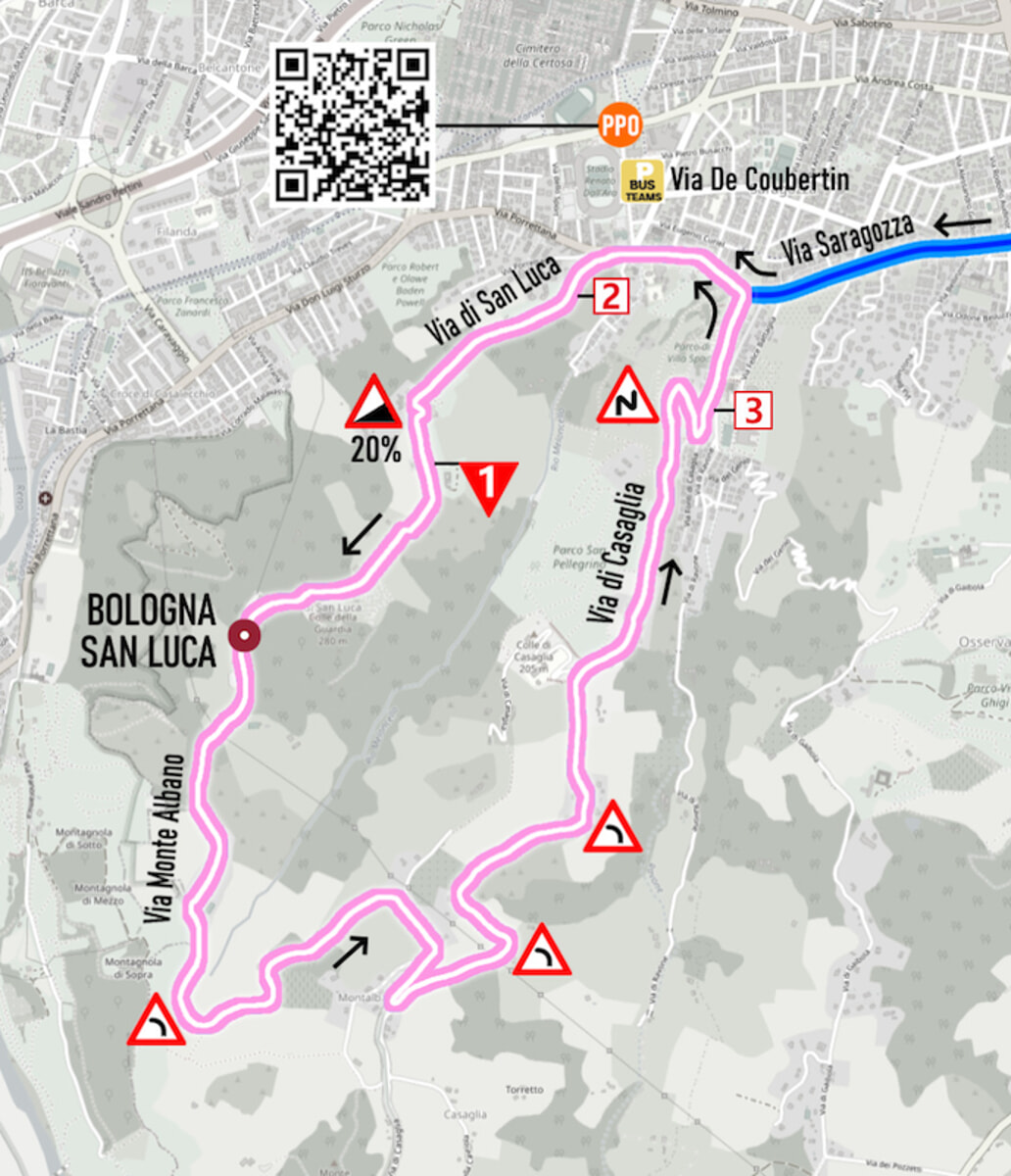 Le caratteristiche della salita di San Luca sono ormai ben note, tuttavia vale la pena ricordare la “curva delle Orfanelle” e il successivo rettilineo di circa 200 metri con pendenza attorno al 18%, proprio in corrispondenza dello striscione dell’ultimo chilometro.