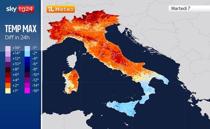Dopo un primo segnale di cambiamento nella circolazione generale, previsto a cavallo del weekend, con i venti che ruoteranno dai quadranti occidentali, l’attenzione si concentra su quanto accadrà già con l’inizio della prossima settimana, quando ci attendiamo un netto rinforzo della pressione sul bacino del Mediterraneo. L’anticiclone delle Azzorre, infatti, inizierà ad abbracciare il nostro Paese, riportando un contesto meteo stabile e un aumento generalizzato delle temperature, specialmente nei valori massimi.Differenze di temperatura massima tra Lunedì 6 e Martedì 7 OttobreE non finisce qui. Entro la metà della settimana, infatti, l’atmosfera potrebbe assumere connotati ancora più miti, soprattutto al Sud, grazie a una maggiore ingerenza anche dell’anticiclone africano.