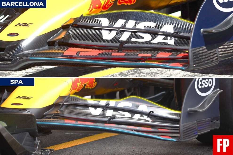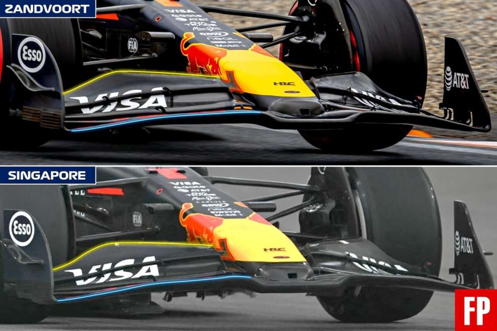 Non è una coincidenza che quella di Milton Keynes sia la squadra che più di tutte ha investito sull’ala anteriore, realizzandone cinque versioni da inizio stagione. Alla specifica di lancio, infatti, sono seguiti gli aggiornamenti dei test, di Barcellona, Spa e adesso Singapore. Tanti sono stati anche i ritocchi ai flap superiori, in particolare in Bahrain, Ungheria e Olanda, tutte piste da alto carico che evidenziano il tentativo di spostare il bilanciamento aerodinamico sull’anteriore. Il lavoro si è intensificato negli ultimi mesi, con il nuovo flap introdotto a Budapest e quello arrivato a Zandvoort, caratterizzato dal particolare generatore di vortice ricavato nella sezione fissa in prossimità del musetto.