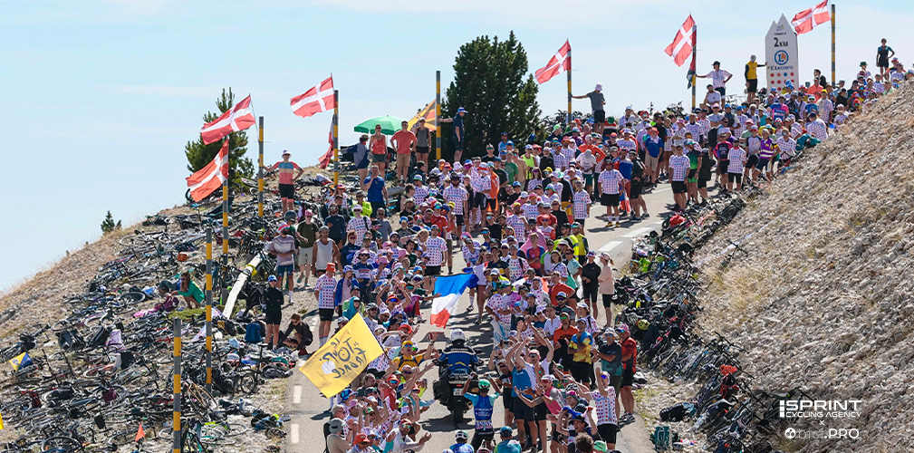 MONT VENTOUX (Francia) – Che sia stato per una crepa o un leggero malessere, la tattica del UAE Team Emirates è parsa subito insolita. Se Pogacar chiede di partire con la bici nera superleggera e poi lascia che la fuga guadagni sei minuti e chiede ai compagni un ritmo regolare, qualcosa forse non va. Abbiamo vissuto l’avvicinamento della corsa alle pendici del monte calvo seduti davanti al maxischermo sulla cima. Un panino comprato nell’ultimo bar, una felpa provvidenziale e lo sguardo fisso sulla corsa. Il vento non era violento come in altre occasioni, mentre tutto intorno lo sguardo si perdeva all’infinito facendo capire perché poeti e campioni abbiano trovato quassù la loro sublimazione.