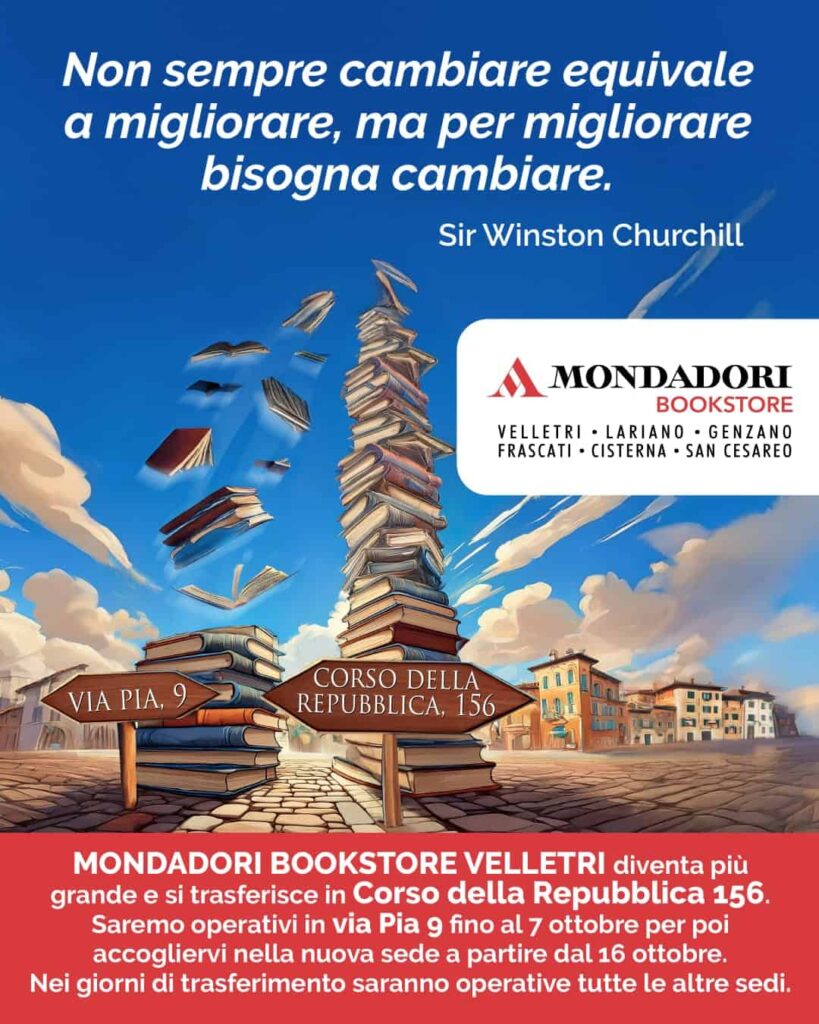 La Mondadori Bookstore di Velletri si prepara a una grande novità. Lo storico punto vendita di Via Pia 9 chiuderà i battenti il 7 ottobre per trasferirsi in una nuova, più ampia e funzionale sede in Corso della Repubblica 156, nel cuore della città, in una posizione privilegiata. Un cambiamento all’insegna della crescita e del miglioramento, come sottolinea anche la citazione di Winston Churchill scelta per annunciare il trasferimento: “Non sempre cambiare equivale a migliorare, ma per migliorare bisogna cambiare.”