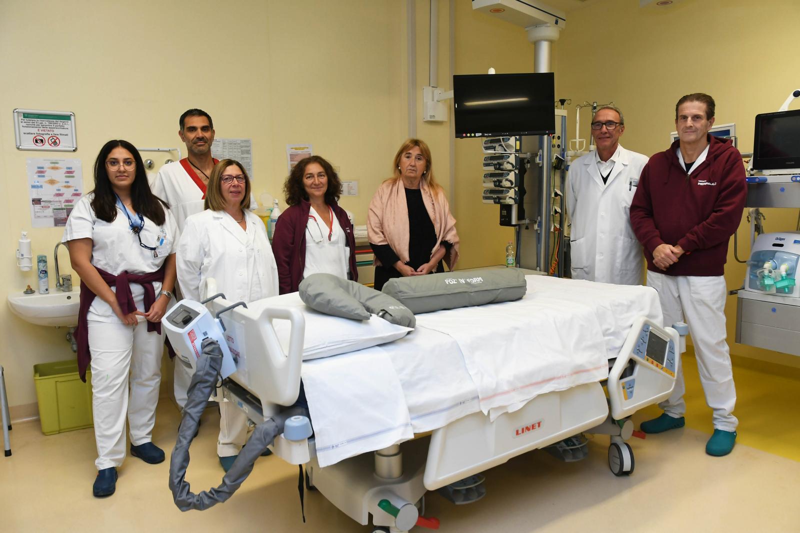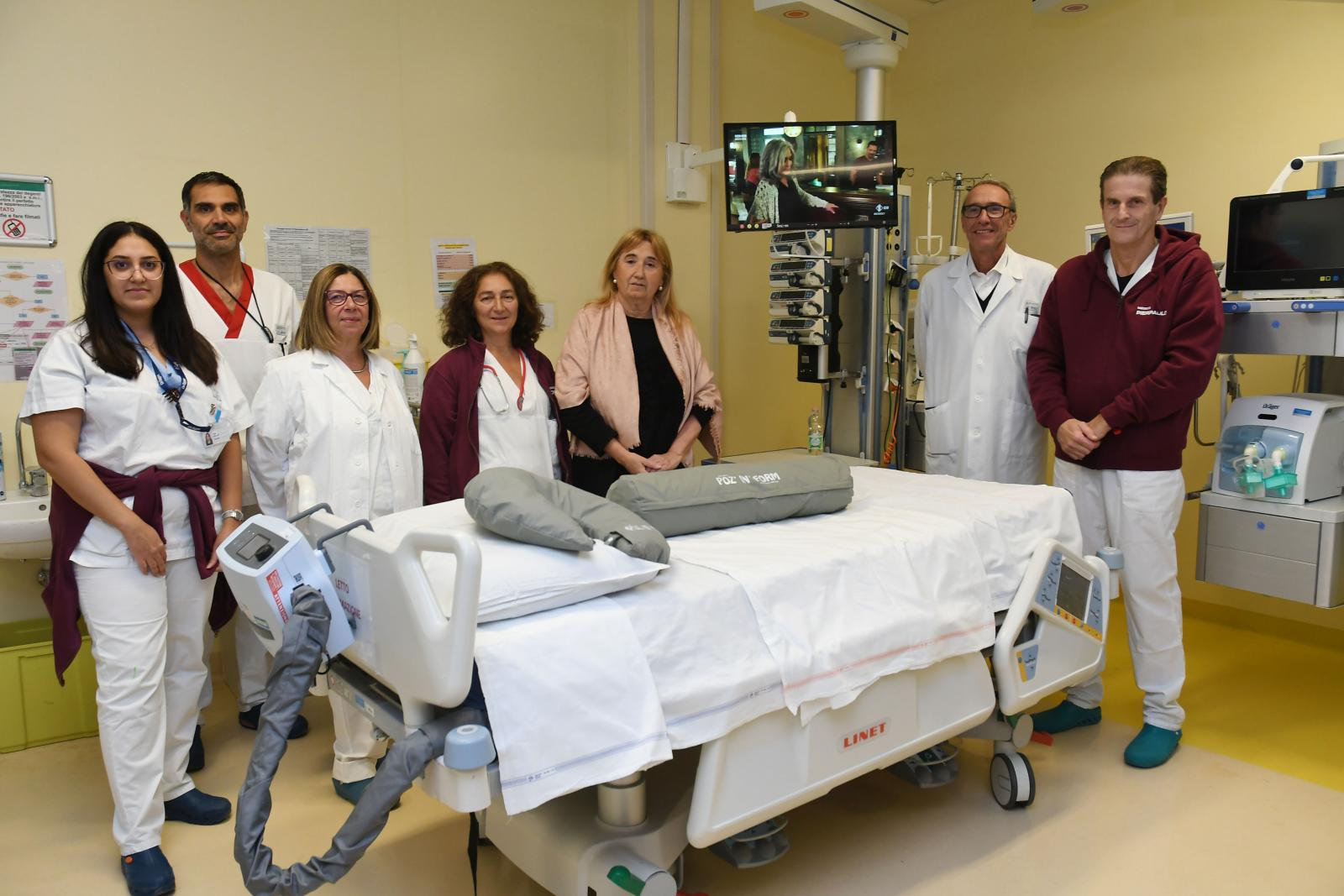 “Guardare un monitor che trasmette immagini in movimento così come un orologio che scandisce il tempo” ha spiegato il dr Salsi “è parte della terapia non medica utile ai pazienti intubati a lungo, insieme alla presenza dei famigliari, per attenuare il cosiddetto delirio da terapia intensiva. I cuscini antidecubito per la pronazione saranno utili a chi affronta l’insufficienza respiratoria, la posizione a pancia in giù beneficia di un migliore scambio respiratorio”.