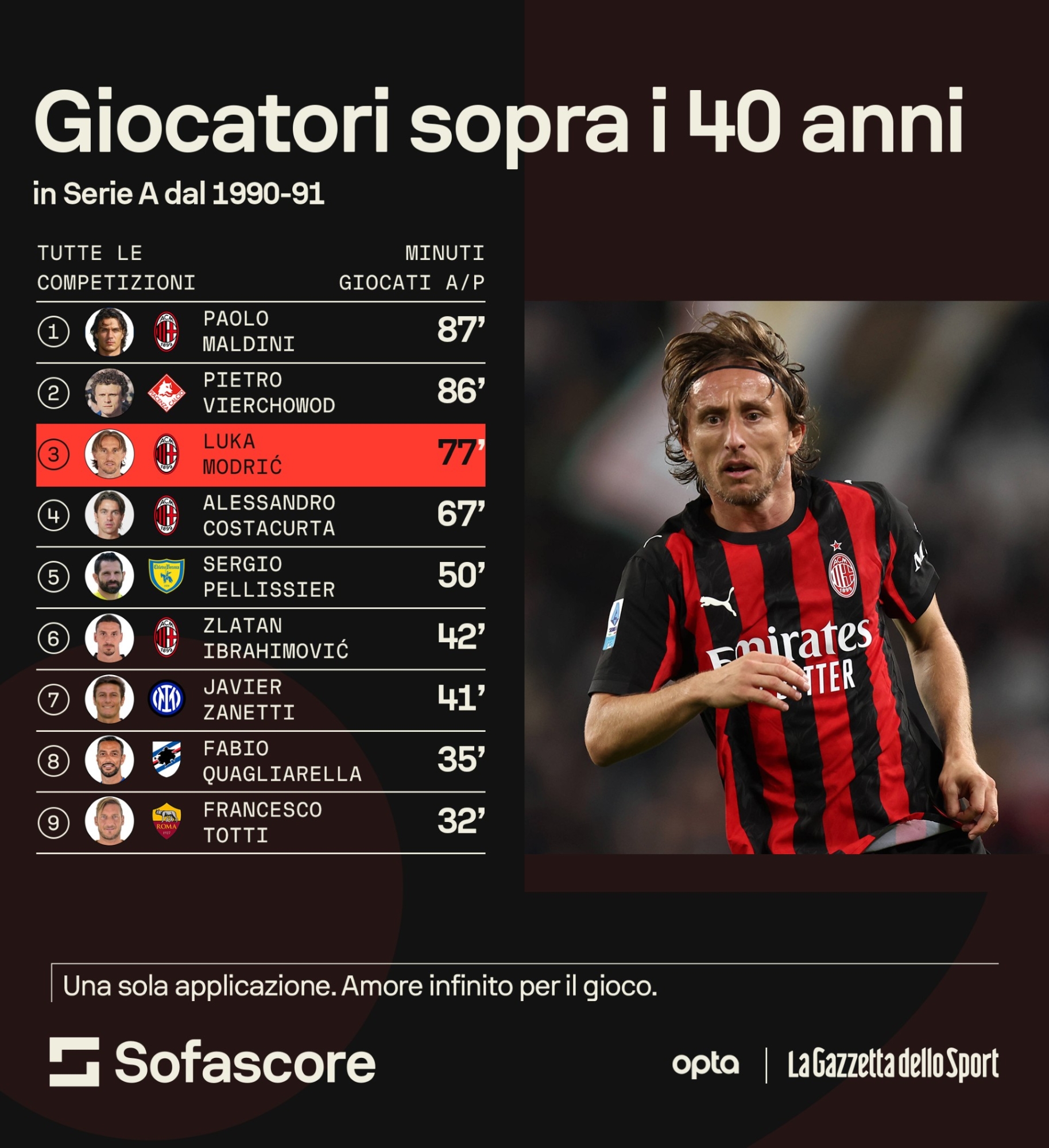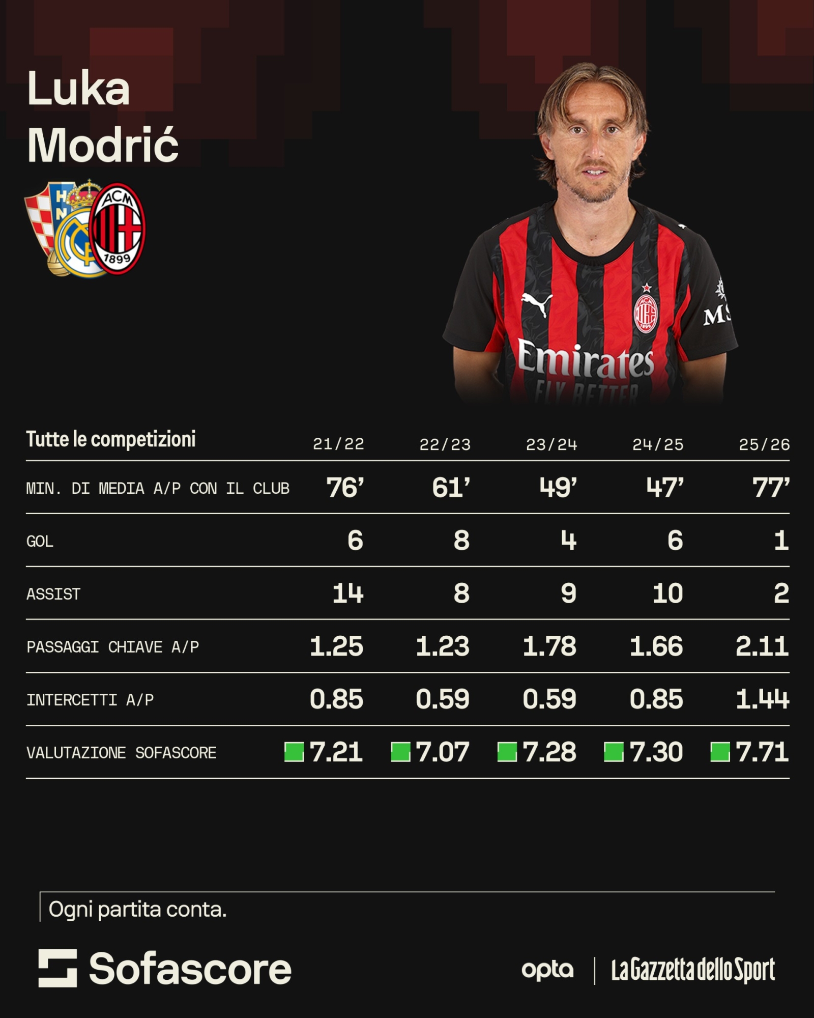 La domanda è automatica: Luka così non rischia di calare nel rendimento o addirittura farsi male? Subito, a istinto, una ragione per temere e una per stare tranquilli. I quarantenni che hanno giocato in Serie A sono pochi, pochissimi: Ibrahimovic, Totti, Zanetti, Costacurta, Quagliarella, portieri come Buffon e Ballotta. Modric deve attraversare un territorio quasi incontaminato: trova tracce di qualche esploratore passato di lì, non un manuale di viaggio testato dalle comitive. Per il Milan è più tranquillizzante pensare che, senza coppe, quei 77 minuti pesano meno. Luka non deve giocare 77 minuti due volte a settimana – sarebbe impossibile – ma può gestirsi da weekend a weekend. Calcolare quanto sta in campo in media in una settimana aiuta a capire. Modric in questa stagione ha giocato 539 minuti con il Milan e 107 con la Croazia: calcolato che la stagione è iniziata da sette settimane, siamo a 92 minuti in media a settimana. Le scorse stagioni sono su livelli simili: 70 e 82 minuti ogni sette giorni nelle ultime due annate col Madrid, 100 minuti nel 2022-23, 95 minuti nel 2021-22. Le coppe, ovviamente, pesano sul calcolo.