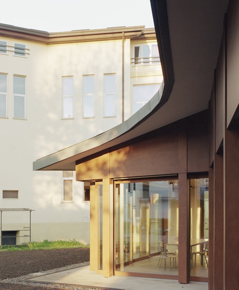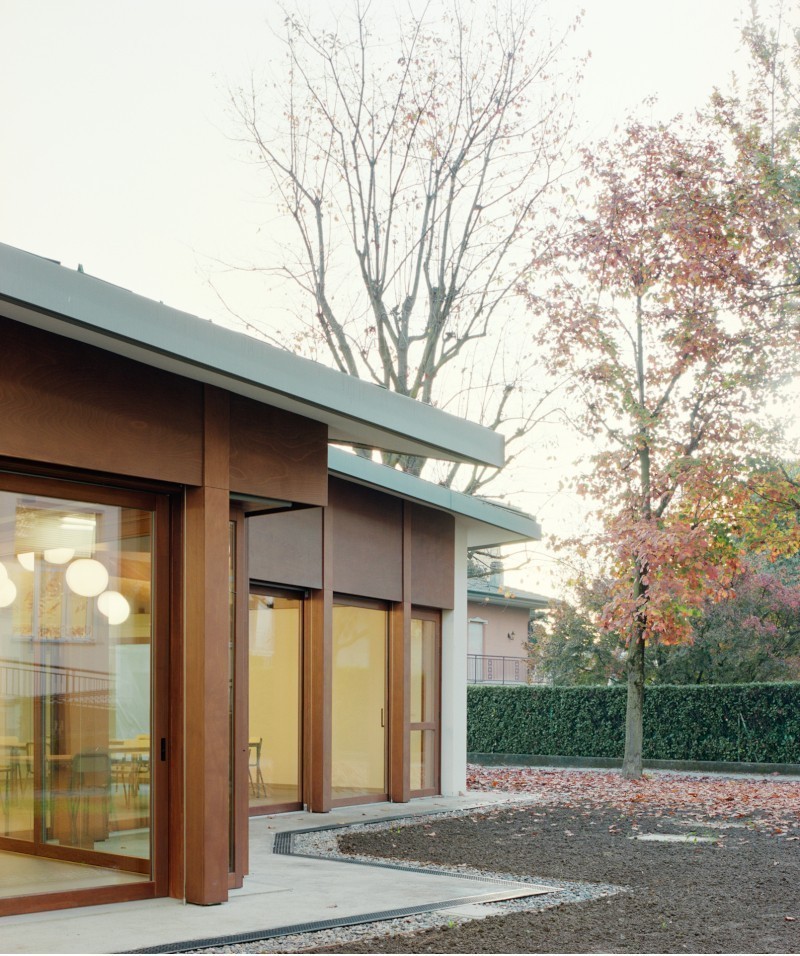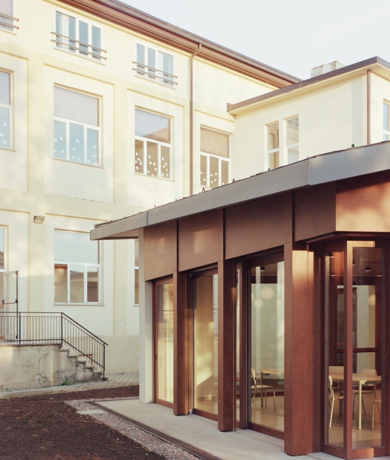 Uno spazio contemporaneo e radicato nel suo contesto, pensato come un’occasione per ridefinire il rapporto tra la scuola e il suo giardino che rappresenta – affermano i titolari dello studio, Emauele Colombo e Paolo Molteni – «un unicum identitario insieme al corpo principale».