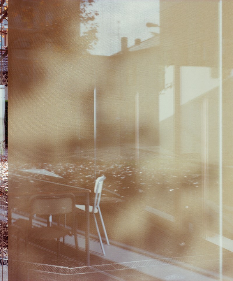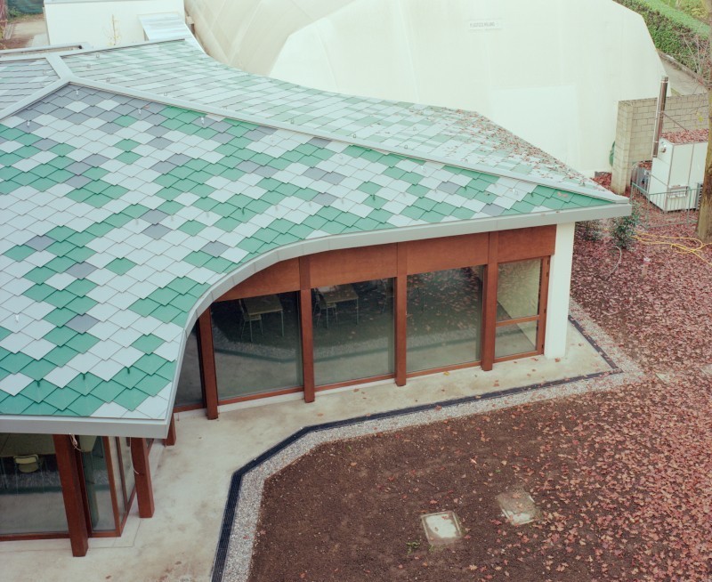 Il tetto – con la sua geometria trilobata – è rivestito con scaglie di alluminio preverniciato, restituendo una texture cromatica che aggiunge vibrazioni di luce e colore al giardino stesso. Gli oscuranti esterni, in tessuto, completano la ritmica della facciata, rafforzando la tensione dinamica del volume.
