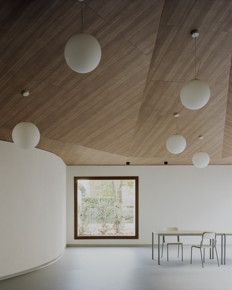 Il progetto ridefinisce anche gli spazi aperti: «Il giardino – spiegano i progettisti – viene ampliato e potenziato: le superfici asfaltate sono sostituite da nuove aree verdi, integrate da alberature e arbusti che arricchiscono l’esperienza sensoriale e restituiscono un paesaggio più ampio e articolato. Il nuovo padiglione non solo si inserisce nel giardino, ma contribuisce ad articolarne le geometrie e a riqualificarlo, diventando parte integrante del suo disegno».