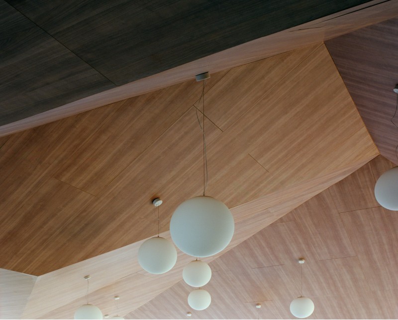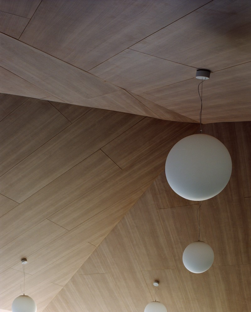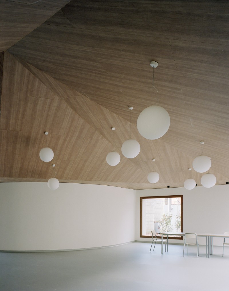 «Gli spazi interni – spiegano ancora i progettisti – amplificano la torsione dinamica del volume, definendo una sorta di cassa armonica pronta a dare voce alla ricreazione degli studenti. I pavimenti vinilici garantiscono funzionalità e continuità materica, i rivestimenti in grès definiscono i locali di servizio, i controsoffitti delle geometrie sorprendenti assicurano un’adeguata qualità acustica allo spazio del refettorio. Tutto concorre a costruire un ambiente ordinato, luminoso e sereno, in cui ogni elemento tecnico diventa parte di un insieme unitario, che lega il fruitore allo spazio che lo circonda».