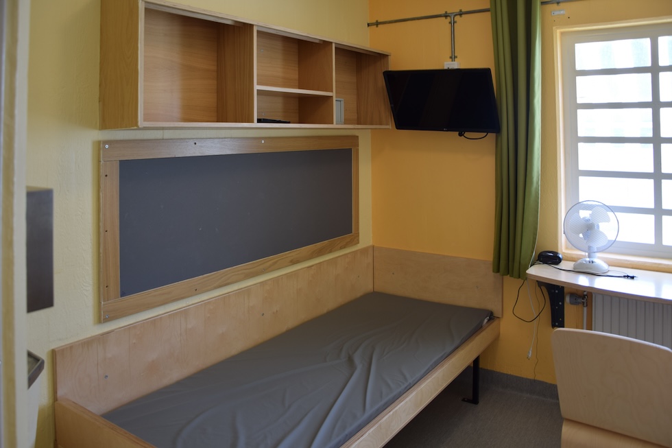 Le celle sono semplici ma curate: un letto in legno chiaro, scaffalature aperte, una scrivania, una sedia, una piccola televisione e una finestra ampia con grate interne. L’ambiente è luminoso, ordinato, privo di elementi oppressivi o barriere visive marcate. Le docce, invece, sono in comune, collocate in spazi condivisi all’interno di ciascun reparto.