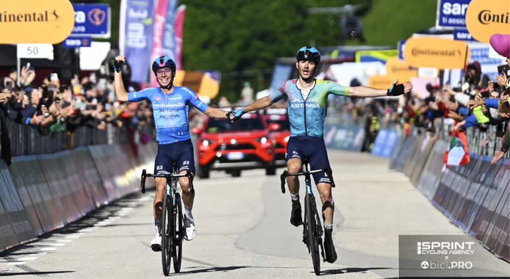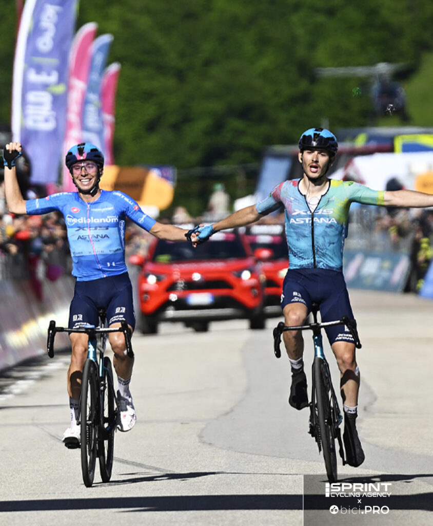 Lorenzo Fortunato e Christian Scaroni sul traguardo di San Valentino Brentonico al Giro d’Italia