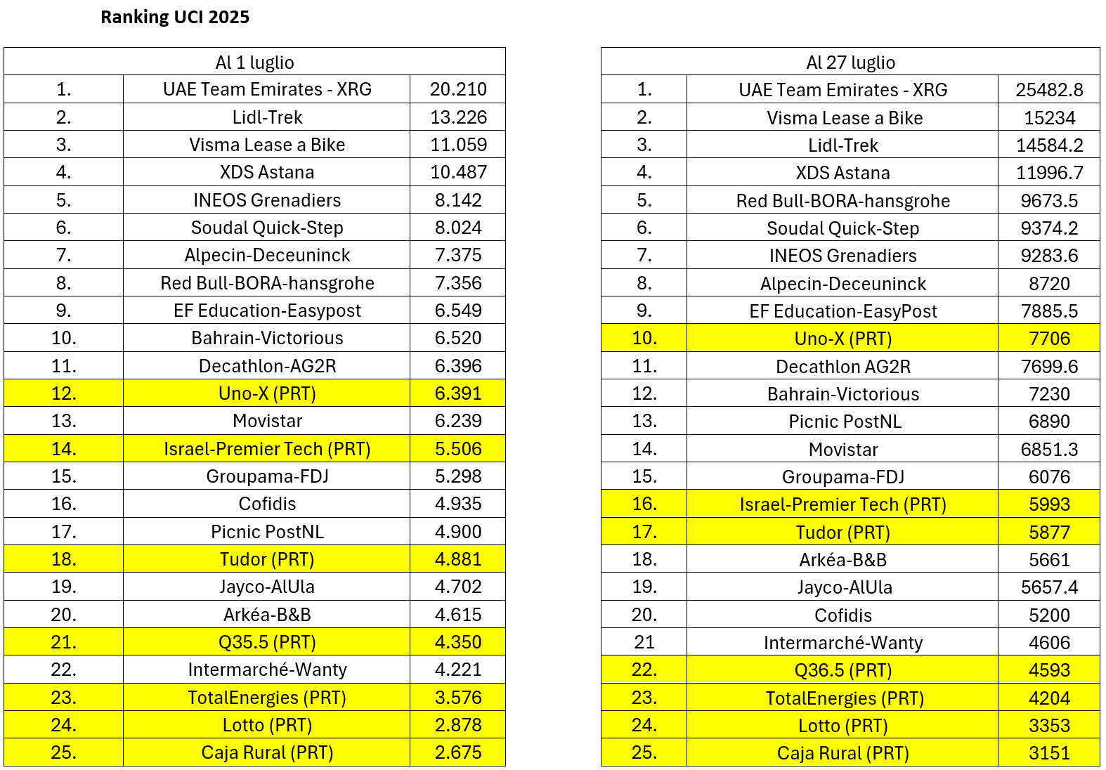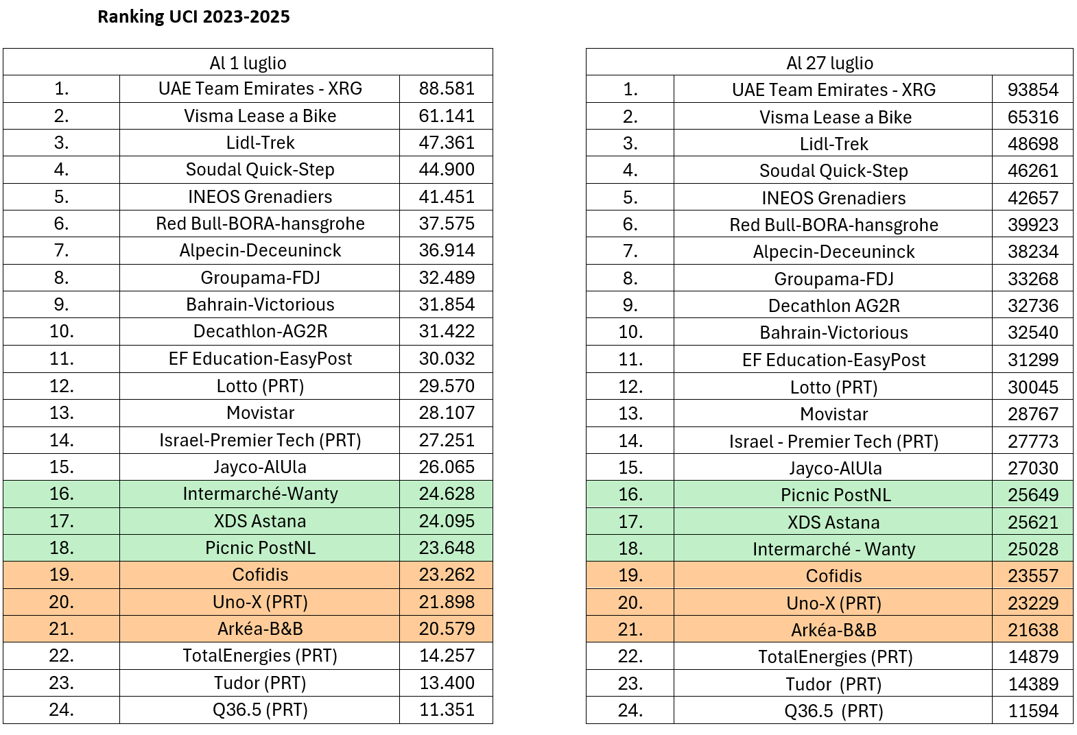 Il riferimento è chiaramente alle cinque formazioni rimaste sotto la soglia dei 500 punti conseguiti, Movistar (475), Lotto (475), Intermarchè-Wanty (385, tutti a firma Girmay), Israel Premier Tech (320) e Cofidis (155), alcune delle quali hanno “pagato” tali score con alcune inevitabili ripercussioni sul proprio posizionamento nel ranking 2023/2025: la formazione belga ad esempio, sopravanzata sia dall’XDS Astana (sospinta nel frattempo anche dai 431 punti conseguiti al Tour of Magnificent Qinghai) che dalla PicNic PostNL, è finita in 18ᵃ posizione (l’ultima per confermare la licenza nella massima categoria per i prossimi tre anni), mentre quella di Roberto Damiani, pur restando in 19ᵃ posizione, ha visto lievitare il distacco dalla zona salvezza da 386 a 1471 punti.