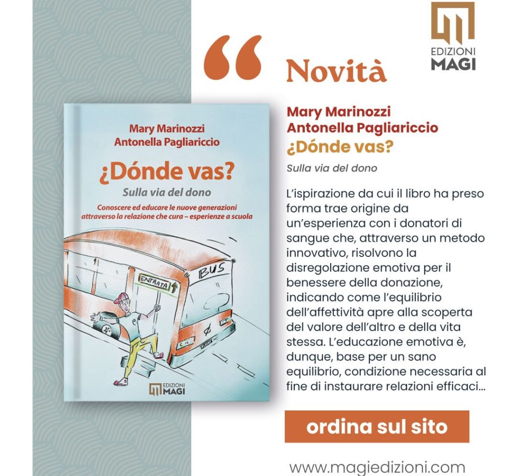 ROMA – Magi Edizioni è orgogliosa di presentare una nuova pubblicazione che si distingue per originalità e profondità emotiva: ‘¿Dónde vas? – Sulla via del dono’ di Mary Marinozzi e Antonella Pagliariccio, un testo che esplora con delicatezza e rigore il potere trasformativo della relazione educativa fondata sul dono, sull’ascolto e sull’affettività. Il libro nasce da un’esperienza concreta con i donatori di sangue, che attraverso un metodo innovativo hanno saputo trasformare la disgregazione emotiva in risorsa, promuovendo benessere e consapevolezza nei giovani. ‘¿Dónde vas?’ non è solo un libro, è un invito a riscoprire il valore dell’altro e la forza curativa della relazione che si prende cura, soprattutto nei contesti scolastici.