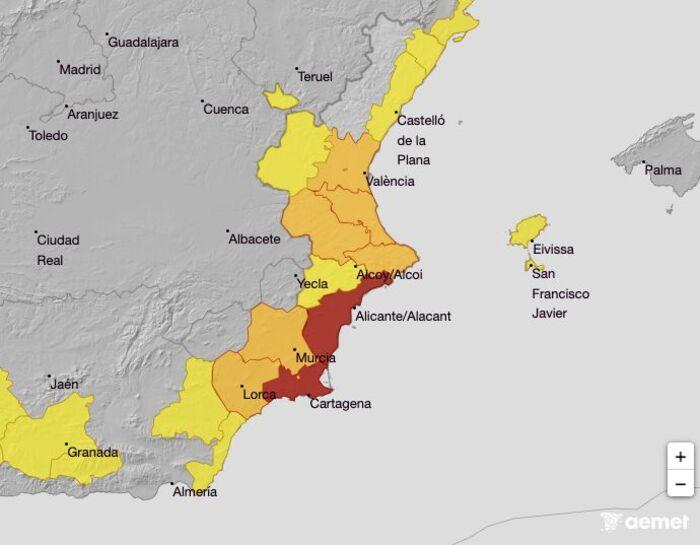 L’AEMET, l’Agenzia meteorologica statale spagnola, ha diramato un’allerta rossa, il livello massimo di rischio, per Venerdì 10 Ottobre nelle province di Alicante e Murcia.