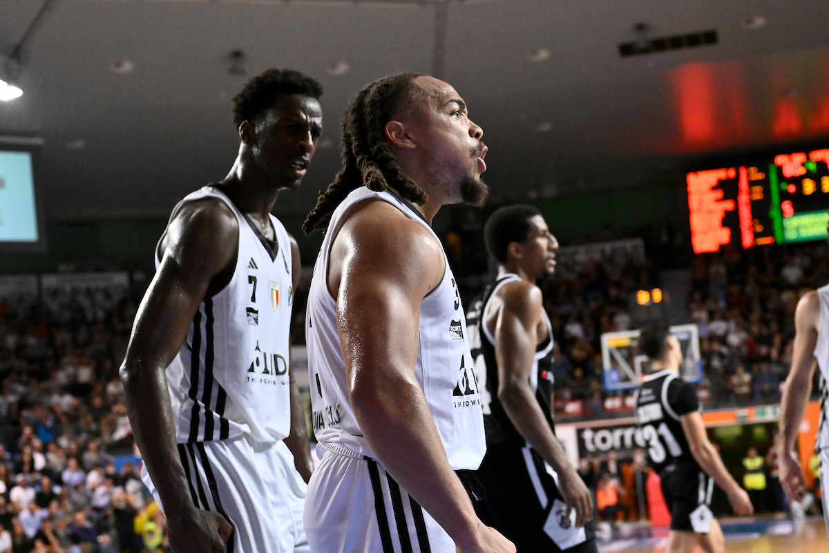 Bendzius segna il 76-74 a 2:44 dalla fine. Poi i liberi di Spencer e Bendzius sembrano poter chiudere i conti, perchè Udine ha il possesso a 33 secondi dal termine e si trova sopra di 4, sull’80-76. Brewton mantiene il possesso quasi sulla linea di centrocampo ma, pressato dal difensore della Virtus, Jallow, fa un palleggio nel proprio campo, regalando il possesso alla Virtus Bologna.