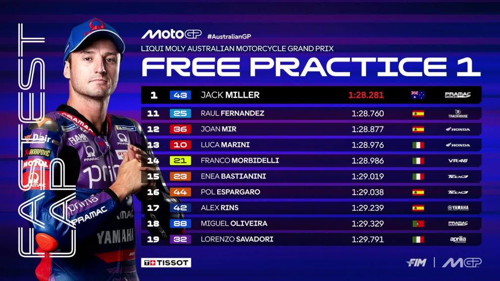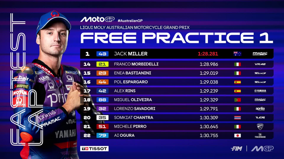 Il pilota australiano della Yamaha ha preceduto Alex Marquez e Pedro Acosta, hanno completato la top-5 Fermin Aldeguer e Fabio Quartararo.