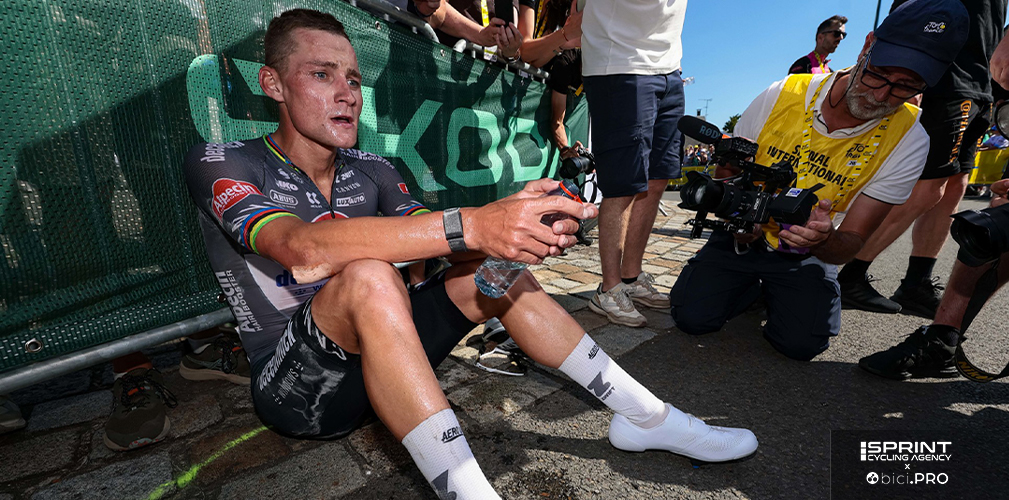 Di caratteristiche. Lui vorrebbe anche, ma spesso spreca e poi salta per aria. Se vai a vedere, anche nelle giornate in cui va in fuga, alla fine cala sempre se ci sono salite lunghe o se ha spinto già da un po’. Difficilmente riesce a fare un grande finale dopo una giornata intensa. Mathieu è il classico esempio di corridore glicolitico: non ha la stessa capacità aerobica di Pogacar o degli scalatori, ma ha tantissima intensità e tante fibre bianche. Quando cala la disponibilità di zuccheri “pregiati”, la sua efficienza scende di colpo.